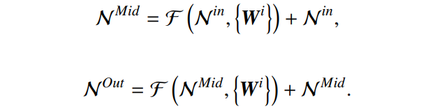 这里选择最简单的2个核大小为3的卷积层作为。假设一个网络为ResNet-6,即两个ResBlocks 被堆叠,可以写出输入输出的关系如下: