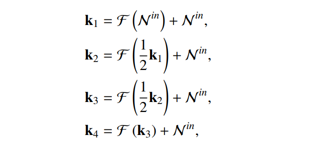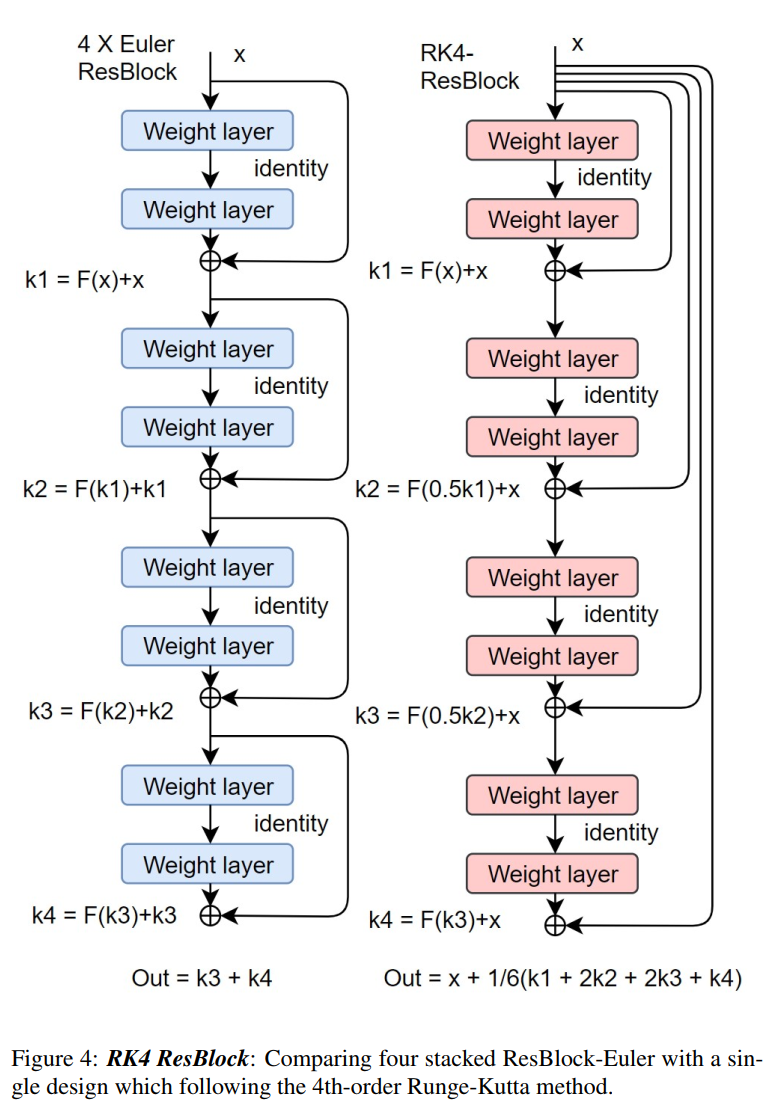 是否可以用4阶的设计来进一步探索?Mai Zhu等人尝试过RK风格的设计。在本研究中将其作为一种堆叠的参考,而不是一个特定的RK-Net。RungeKutta方法(RK4)用一个4-step的方法来更新它,本文实现的ResBlock-RK4可以这样写: