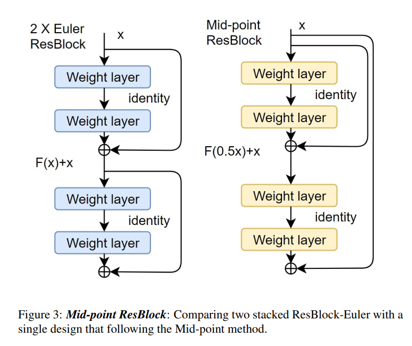 如果在网络设计上比较ResBlock-Euler和ResBlock-Midpoint会有不同的叠加,如图3所示。现在有一个4层的块设计,而不是2层的设计。然而,堆叠对相同的Euler scheme进行层/阶的平等对比。