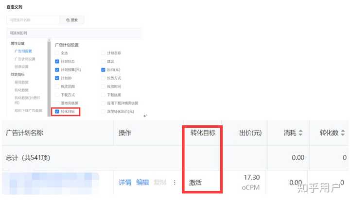 另外有一个小的建议,在计划层级“自定义列”的选项中,勾选“转化目标”这一项,这样可以在计划层级直接看出转化目标选的是什么,不用到转化跟踪那才能看,有误选的情况能早点发现。