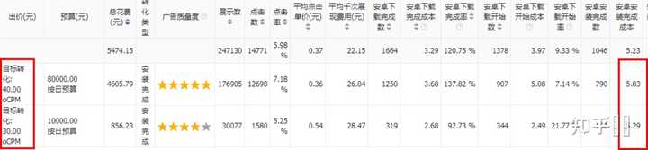 我们先说成本能达到预期的情况。能达到预期就不用降出价,这么投着就行了。这种情况可遇不可求,成本又低、计划竞争力又强(出价高所以eCPM值很高),简直完美。像下面这两条计划。这两条计划转化目标都是安装完成,所以安卓安装完成成本就是转化成本。
