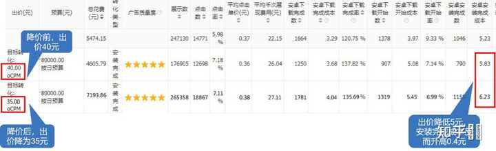 比如下面的这个例子:把出价从40降到35,安装完成成本从5.8涨到了6.2。那怎么能控制成本?除非你把出价降到真实预期成本,否则都实现不了。