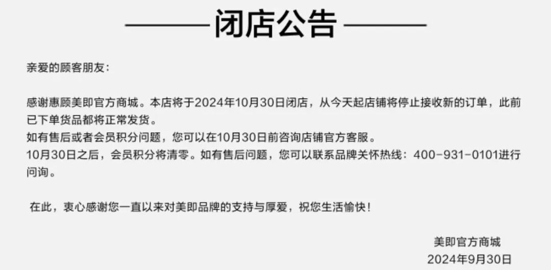关停所有店铺,又一知名品牌倒在了双11前夜电商行业关注共 4776字,需浏览 10分钟 ·2024-10-08 20:31 电商这碗饭,越来越难吃了。 出品 | 电商行业 作者 | 吴昕 欧莱雅旗下品牌美即宣布关店 随着国庆假期的圆满落幕,一年一度的双11购物狂欢节悄然临近,各大电商平台正紧锣密鼓地筹备,誓要在这场年度盛宴中拔得头筹。 然而,在这场硝烟弥漫的商战中,却传来了一个令人意外的消息:欧莱雅旗下知名品牌美即,近日宣布了其官方商城的闭店计划。 具体而言,美即官方商城将于10月30日正式关闭,自9月30日起,该店铺将停止接收新订单,但已下单的商品将按原计划正常发货。 10月30日之后,美即会员的积分将被清零。为确保顾客权益,美即提醒,如有售后需求或积分问题,请在10月30日前联系店铺官方客服进行咨询。 图源:美即微信官方商城 目前,美即在天猫、京东等主流电商平台的官方旗舰店已无法搜索到,标志着其线上渠道的全面收缩。 不过,唯品会上的“美即官方特卖旗舰店”仍在运营,但商品数量有限,该平台上的品牌客服表示暂未接到关店通知,所有可下单商品均享受平台售后保障。 图源:唯品会 此外,京东平台的美即品牌客服透露,消费者仍可通过屈臣氏及其合作的多家线下零售渠道购买美即产品,包括普丽生、娇兰佳人、信和美妆等。 图源:京东 值得注意的是,美即的官方微信公众号已停更两个多月,官方微博的最新动态也停留在9月10日,这些迹象似乎也是在为关闭所有线上平台做铺垫。 图源:微博 美即的关店消息传出后,引发了网友们的广泛关注和热议。许多网友纷纷表示,美即曾是风靡一时的品牌,如今却走向衰落,成为“时代的眼泪”,令人唏嘘不已。 对于美即这个品牌,或许有些人会感到陌生。但提到“美即面膜”,相信很多人都会有所耳闻。 美即面膜创立于2003年,以其独特的“平价面膜+单片销售”模式,重新定义了面膜产品的快消属性,迅速占领了包括屈臣氏、沃尔玛等在内的线下零售渠道,曾被誉为中国的“面膜之王”。 2010年,美即成功登录香港证券交易所,成为国内面膜上市第一股。2012年,美即面膜达到了历史巅峰,在国内市场份额占据了26.4%,销售额超过10亿元。 2013年,风头正盛的美即被国际美妆巨头欧莱雅集团以65.38亿港元(折合约人民币54.33亿元)全资收购,并纳入其大众化妆品部门。 然而,被收购后的美即并未如愿创造盈利。2016年上半财年,美即业绩出现减值亏损2.13亿欧元(约合人民币16.67亿元)。随后,有消息称,2016年一整年美即的回款不足2亿元,相比2012年巅峰时期的13亿元下滑近90%。 欧莱雅也曾尝试挽救美即。2014年,欧莱雅中国研发中心大楼设立了“美即面膜专研中心”,并推出了鲜注膜力面膜。这一举措促使美即在2017年实现了双位数的增长回归,但市场份额却跌出了前六名。 值得一提的是,2018年,欧莱雅将美即从屈臣氏全面下架,官方回应称这是品牌的战略决定,将电商作为品牌的主力渠道。 但近年来美即在电商平台的表现也不尽如人意。 飞瓜数据显示,2024年上半年,美即在抖音的GMV(商品交易总额)仅为10-25万元,位于抖音美妆排名4176位。过去几年,其在抖音的销量也一直处于低迷状态。 在当下头部美妆品牌的明星单品抖音年GMV动辄超1亿元、10亿元的背景下,美即的销量显得尤为惨淡。 此次美即全面收缩线上渠道并再度聚焦线下,与当前国货美妆品牌普遍倚重线上渠道的趋势截然不同。 这一决策背后,或许隐藏着美即对于市场变化的深刻洞察和战略调整。 在商业决策的天平上,及时止损往往比持续内耗更为明智。 对于美即而言,选择体面地关店,或许是在当前形势下所能做出的最佳选择。 卷不赢,就淘汰 实际上,美即并非孤例,近期,众多品牌纷纷撤离电商平台,这股风潮不仅席卷了海外知名品牌,也波及了国内本土品牌。 以美妆护肤领域为例,4月19日,高丝宣布正式关闭天猫旗舰店;5月,日本FANCL集团旗下的纯净护肤品牌Boscia(博倩叶)也宣布将于5月31日正式关闭;紧接着,美国欧莱雅旗下美妆品牌NYX PRO MAKEUP亦宣布将于6月21日结束天猫国际官方旗舰店的运营。 不久前,资生堂旗下高端护肤品牌BAUM葆木也宣布8月10日正式闭店,其微信商城及上海静安芮欧百货的首家专柜同样停业。资生堂集团对此回应称,BAUM葆木品牌基于战略考量,已决定暂停国内的产品销售。 “倒闭潮”仍在持续蔓延。据联商网的不完全统计,截至今年8月,已有24个美妆品牌宣布关店、退出或破产清算,其中17个为海外品牌,如贝玲妃、The Body Shop、KIKO、高丝等,这些品牌曾是消费者心中的热门之选。 图源:联商网 同时,随着线上流量增长触顶,行业竞争加剧,也有众多国内品牌在这场没有硝烟的战争中纷纷败下阵来。 2024年上半年,累计官宣闭店的国货品牌达6个,其中护肤品牌占4个,彩妆、香氛品牌各占1个。 2024年上半年,护肤品牌的生存环境尤为恶劣,占“倒下”品牌总数的三分之二。而在彩妆品类中,仅拉芳家化旗下平价彩妆品牌VNK宣布关停,该品牌曾因知名主播李佳琦的力荐而迅速走红,并创下销售额破千万的佳绩。 图源:聚美丽 这些品牌陷入困境,实则源于多重因素的交织。 市场竞争的白热化使得各品牌为争夺市场份额而陷入价格战与资源战的泥潭,品牌间的差异化日益模糊。同时,品牌自身的产品创新不足,同质化现象严重,难以在消费者心中树立独特的品牌形象。 此外,