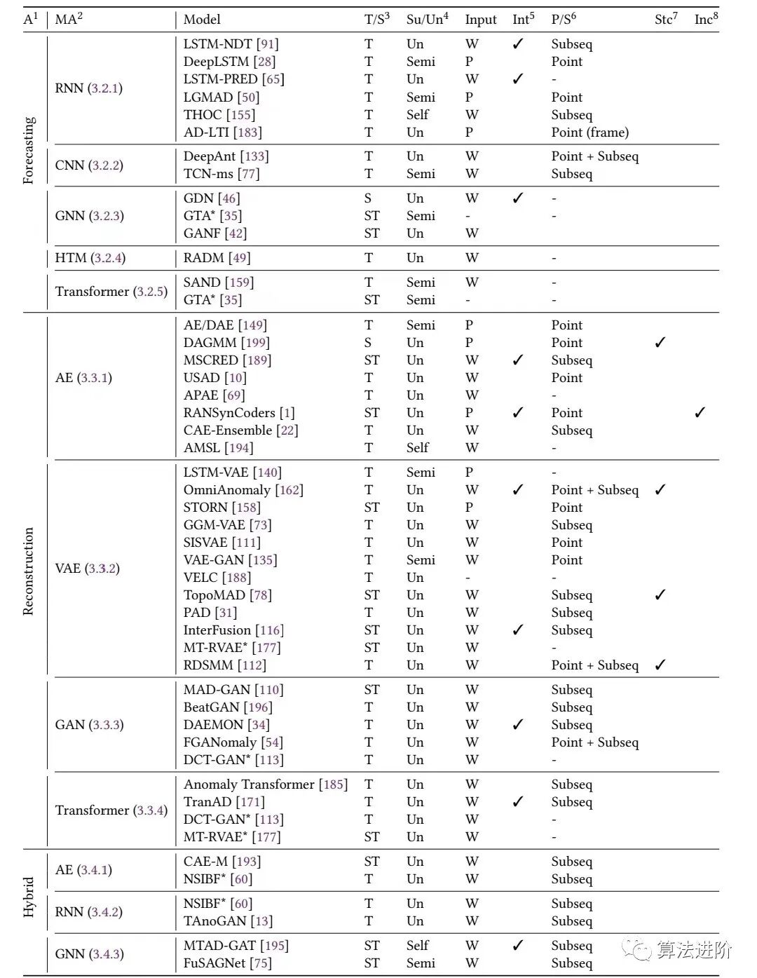 表1和表2分别总结了基于它们处理的输入维度的单变量和多变量时间序列的异常检测模型。这些表格概述了以下方面的模型:(1)时间/空间,(2)学习方案,(3)输入,(4)可解释性,(5)点/子序列异常,(6)随机性,(7)增量。