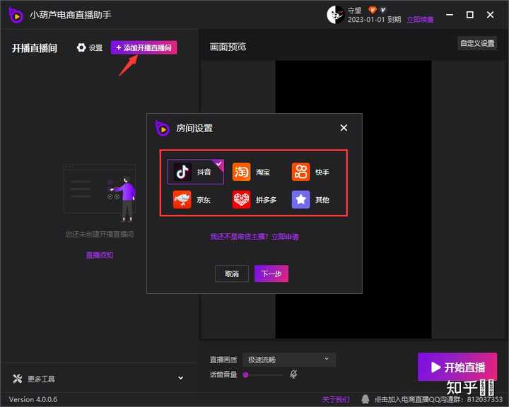 点击添加开播直播间,选择自己需要直播的平台