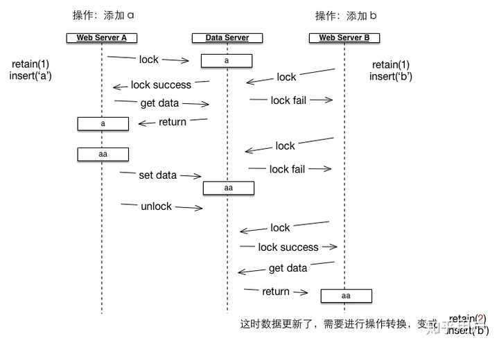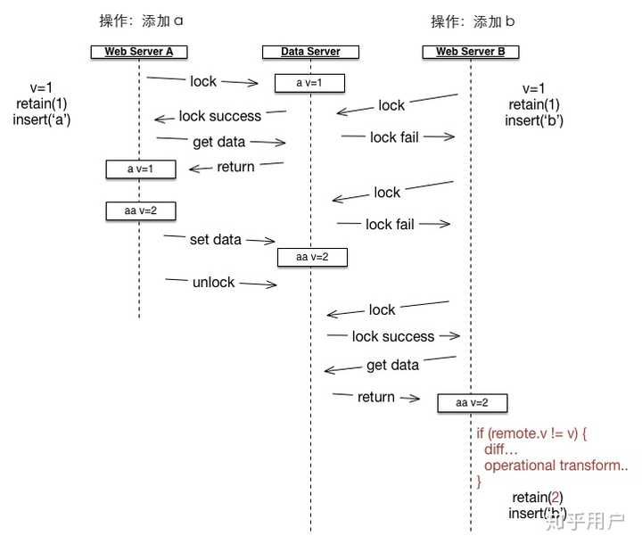 在这个例子中,Web Server A 接收到操作命令是将「a」文本改成「aa」,Web Server B 接收到操作命令是将「a」文本改成「ab」,这里我们加上了锁机制来避免同时读写数据,Web Server A 首先得到了锁,然后修改并更新数据,而 Web Server B 需要先等待数据解锁,等 Web Server B 拿到数据后它已经从「a」变成了「aa」,如果还按照 retain(1), insert('b') 进行修改,数据将变成「ab」,而不是正确的「aab」,引起这个问题的原因就是旧版本不一致,Web Server B 需要根据 Web Server A 的操作进行操作转换,变成 retain(2), insert('b'),然后才能对数据进行修改。