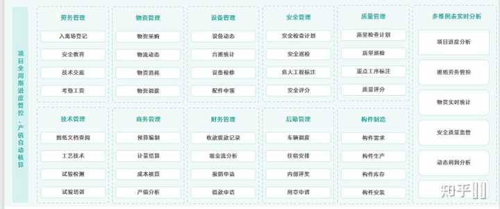 一个完整的项目管理系统,大体上包括进度、劳务、物资、设备、安全、质量、技术、商务、财务、后勤、构件制造这11个方面。