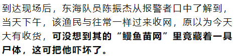 温州渔民捕鱼,渔网里发现一具尸体!掌上温州关注共 308字,需浏览 1分钟 ·2021-03-23 18:22 来源:龙港蓝媒网3月21日下午16点许分,龙港市东海救援中心24小时战备值班室,接到市110指挥中心报警电话:称报警人称海港路第一码头的江里发现一具尸体,请前往处置。接到指令后,东海值班副队长李余战紧急预案,并火速带领队员,杨仲治、陈振杰、董大真等人出动作战装备赶赴现场。福音见证关注下方公众号,接受主的恩典。听更多诗歌点击下方名片关注赞 美 诗 歌 浏览 26点赞 评论 收藏 分享 手机扫一扫分享分享 举报 评论图片表情视频评价全部评论推荐 温州一男子债务缠身,离家出走!河里发现尸体掌上温州0隐秘的电商生意:我花35块网购,收到一具尸体电商行业0温州市区一河道发现浮尸掌上温州0视频:温州市区一河道内发现浮尸....掌上温州05G承载网里的FlexE,到底是什么?物联网智库0cocos2d 高仿捕鱼达人cocos2d高仿捕鱼达人。[Code4App.com]cocos2d 高仿捕鱼达人cocos2d 高仿捕鱼达人。 [Code4App.com]温州初中生举报老师校外补课,被发现后!掌上温州0我在微店新品《全民捕鱼》中,发现一个人人能挣钱的商机Creator星球游戏开发社区0数据资产管理:数据发现,发现什么,怎么发现?数据工匠俱乐部0点赞 评论 收藏 分享 手机扫一扫分享分享 举报