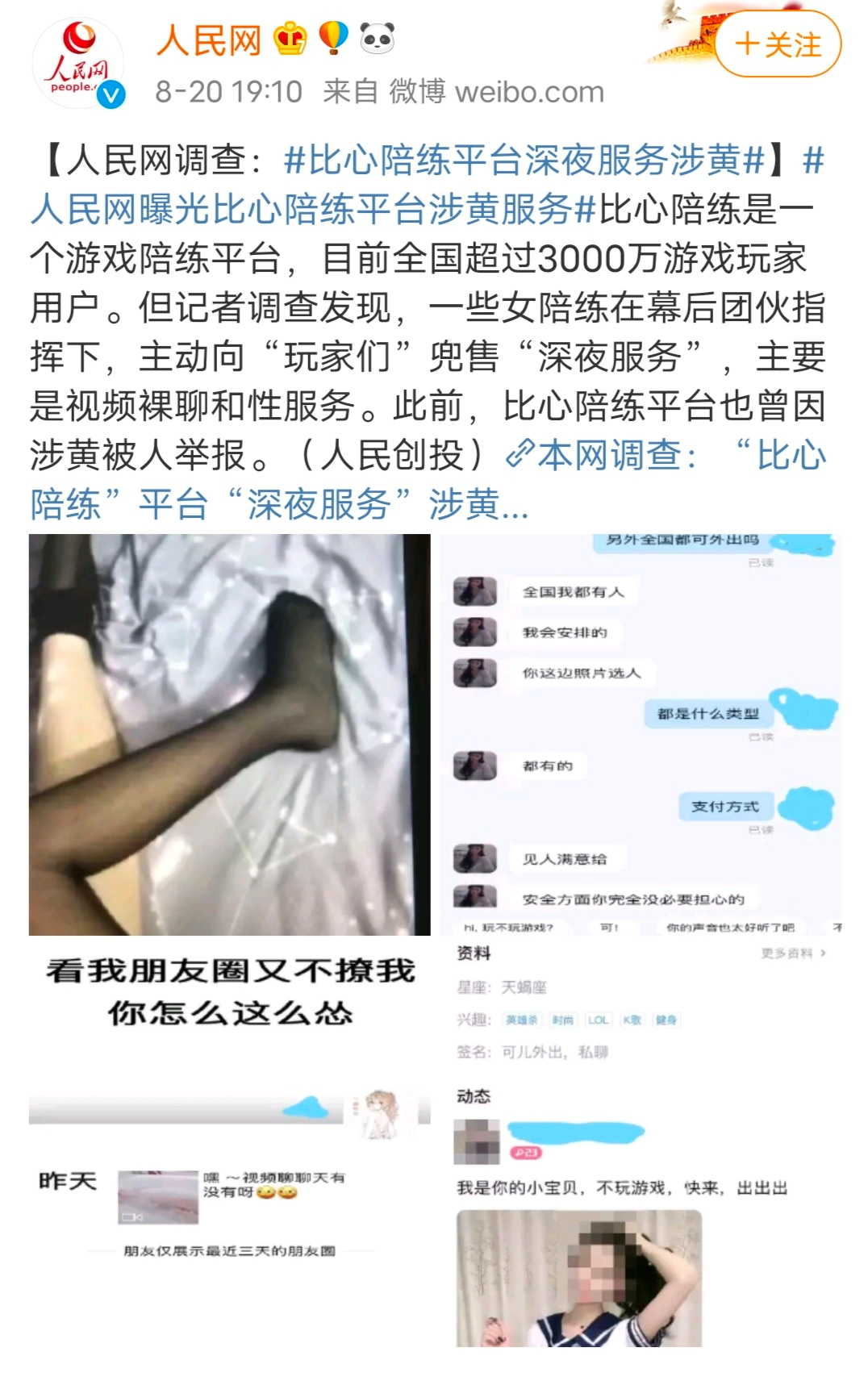 本月20号,人民网发微博称:比心平台部分女教练主动兜售“深夜服务”。
