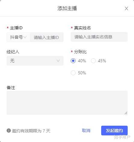 下图为公会后台邀约主播界面,大家可以大家可以看到公会给主播设置的提成最低只有30%,最高就是50%。(后台系统已更新为最低30%,但是知乎最近不能上图,所以用的之前的图)