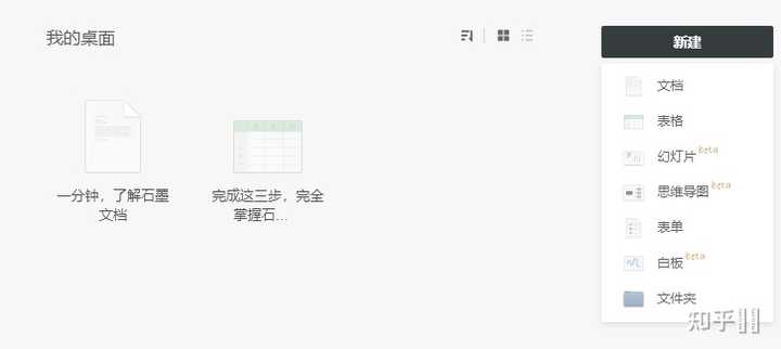 登录进石墨文档后,可以看到整个界面比较整洁简单,功能上支持文档、表格、表单等,有beta版的幻灯片、思维导图和白板,功能上能满足基本的操作。