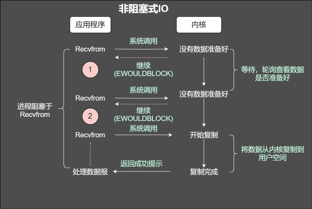 咱们知道套接字有个缓冲区,如果缓冲区没有数据可读,那么在非阻塞的情况下调用read就会立即返回,返回自然会有个状态,不然我们一脸懵逼,无法进行下一步。返回可能是EWOULDBLOCK或者EAGAIN出错信息。