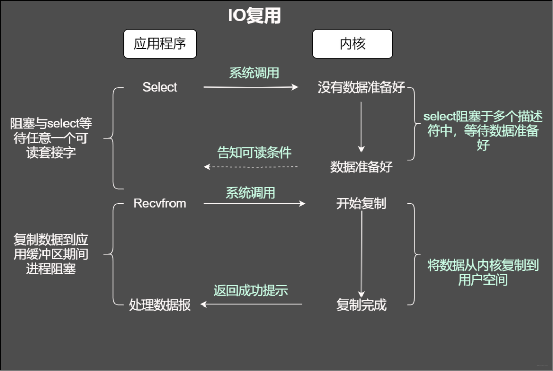 当使用select函数的时候,先通知内核挂起进程,一旦一个或者多个IO事情发生,控制权将返回给应用程序,然后由应用程序进行IO处理。