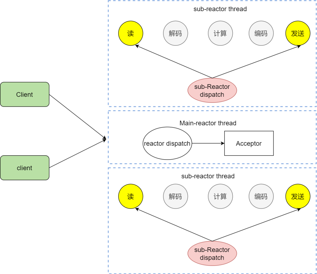 我们看看主从reactor的方式,思路很清晰,主reactor主负责分发Acceptor连接建立,然后已经联机的IO事件交给sub-reactor,这个sub-reactor的数量可以根据CPU的核数来定。