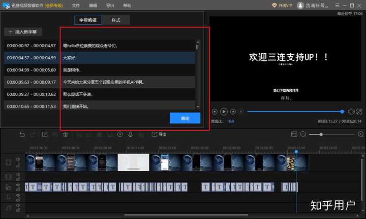 优点:里面有海量的素材,如30+滤镜效果、300+转场效果、200+动画效果、100+文字效果、70+叠加效果和600+配乐素材。强调一个亮点功能,它能自动识别视频中的语音,然后转换成字幕,如下图: