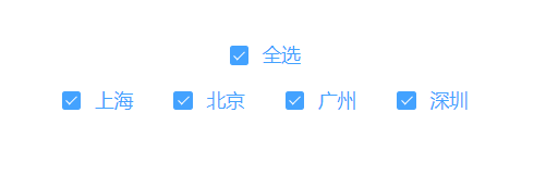 对数组 cities: ['上海', '北京', '广州', '深圳'] 进行遍历生成 4 个多选框,同时绑定点击事件 handleCheckedCitiesChange,该方法是用来判断是否为全选中的,this.checkAll = checkedCount === this.cities.length,如果当前全部选中数据的长度等于初始化数组 cities 的长度,则证明全部选中,再将判断结果赋值给 checkAll。