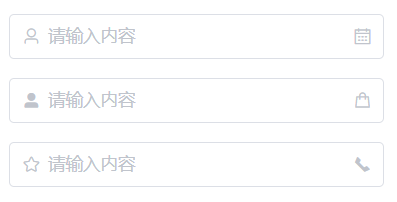 <div style="width: 300px"><el-input v-model="input" placeholder="请输入内容" size="medium" suffix-icon="el-icon-date" prefix-icon="el-icon-user">el-input><div style="margin: 15px 0;">div><el-input v-model="input" placeholder="请输入内容" size="medium" suffix-icon="el-icon-goods" prefix-icon="el-icon-user-solid">el-input><div style="margin: 15px 0;">div><el-input v-model="input" placeholder="请输入内容" size="medium" suffix-icon="el-icon-phone" prefix-icon="el-icon-star-off">el-input>div>