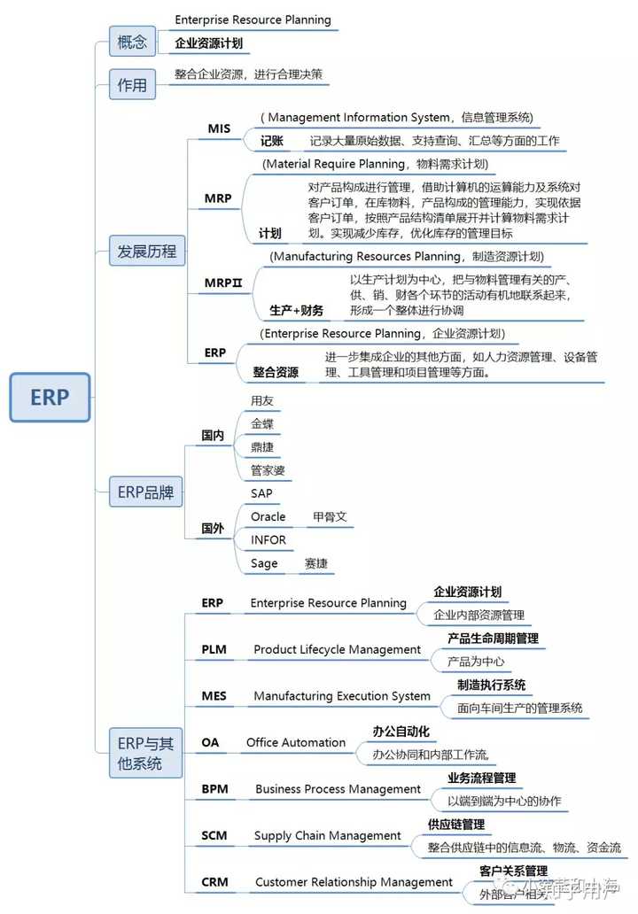 总而言之,从最开始的MIS“记录”,发展到MRP“计划”,再到MRPⅡ加入财务模块,到最终各种企业资源都纳入ERP进行管理,对物资资源管理(物流)、人力资源管理(人流)、财务资源管理(资金流)、信息资源管理(信息流)集成一体化。