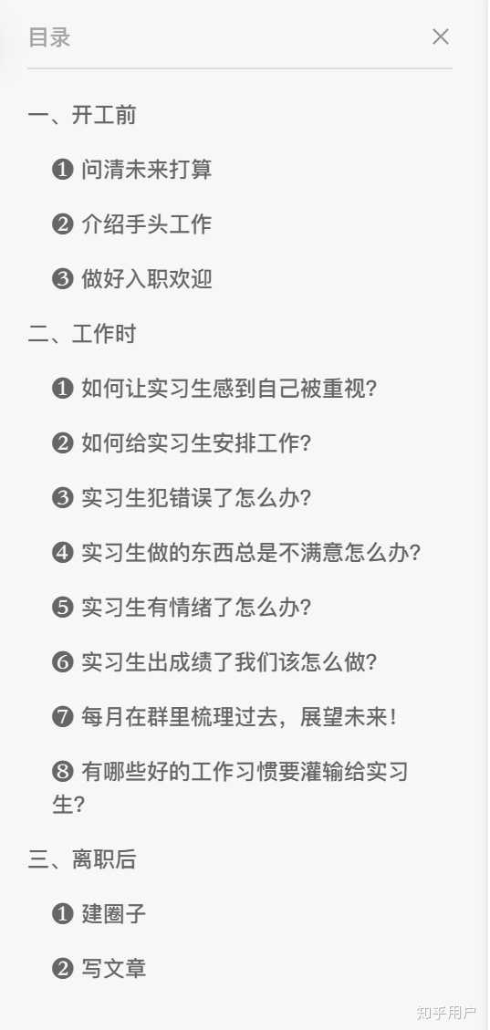 这是我之前写的《实习生培训文档》,按照时间顺序,以逻辑树的形式,对实习生培养这块进行细致拆解。