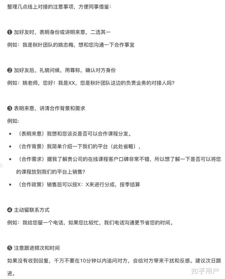 比如我个人沟通能力不行,所以当时看到我们公司的商务百合姐,在工作群分享线上对接注意事项时,觉得非常好,就立马收藏了起来。