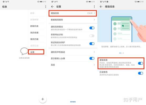 在华为/荣耀手机中:点击打开信息图标——点击右上角的菜单按钮——点击设置——选择最上方的增强信息——打开增强信息开关。