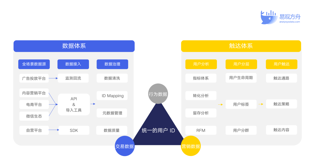 易观数科提出,全场景私域用户运营离不开两个基础能力的建设,一个是数据体系,一个是触达体系。数据体系最终是为了更好地进行用户细分,触达体系最终是为了更好地进行用户转化,两者缺一不可。
