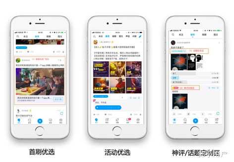 同时最右还有以下三大信息流资源,分别是:首刷优选、活动优选和神评/话题定制区,如下图所示: