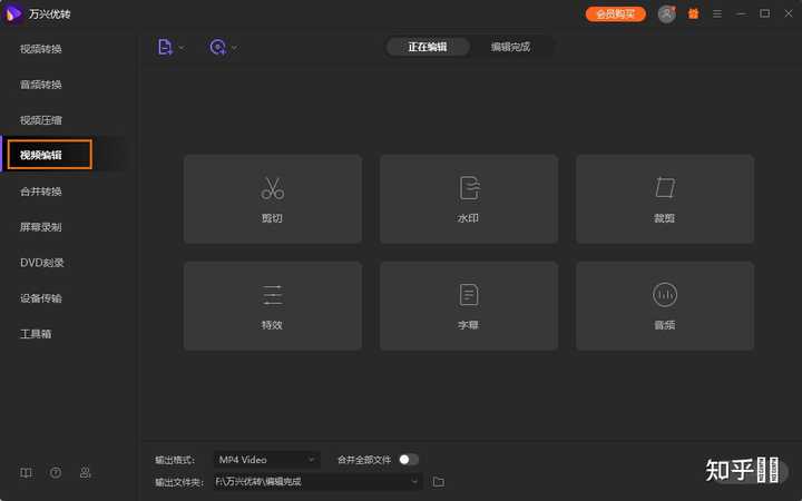 启动万兴优转,在左侧导航栏选择视频编辑功能板块,界面上将会显示如下的基本编辑功能。选择剪切功能,导入你希望编辑的视频内容。