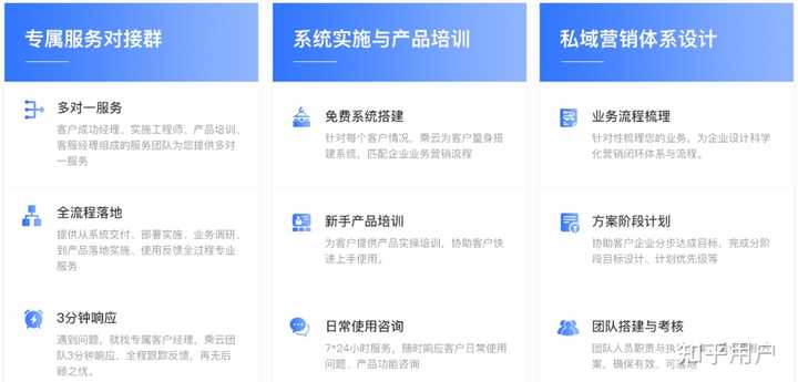 3、落地服务:专业的运营客服团队7*24h对接;企业微信客服群对接,多对一服务、全流程落地、3分钟响应乘云团队等。