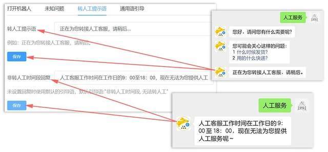 比如当有重复问题、未知问题、某个关键词出现多少次时,转接人工客服。这部分消息通过后台设置绑定人工客服后可以在芝麻客服客服系统看见。