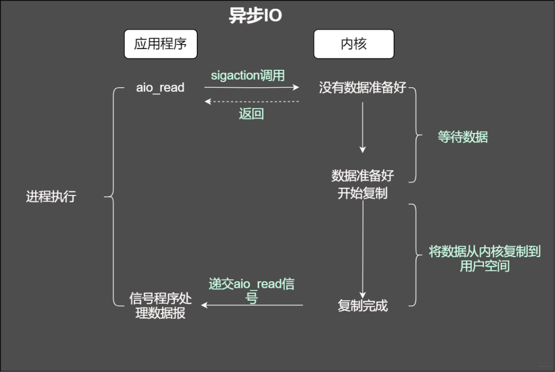 用程序告知内核启动某个操作,并让内核在整个操作(包括将数据从内核拷贝到应用程序的缓冲区)完成后通知应用程序。那么和信号驱动有啥不一样?