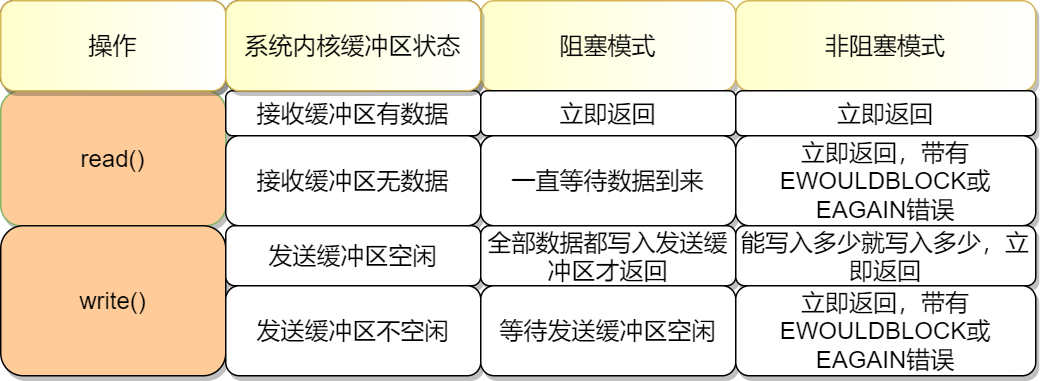 咱们知道套接字有个缓冲区,如果缓冲区没有数据可读,那么在非阻塞的情况下调用read就会立即返回,返回自然会有个状态,不然我们一脸懵逼,无法进行下一步。返回可能是EWOULDBLOCK或者EAGAIN出错信息。
