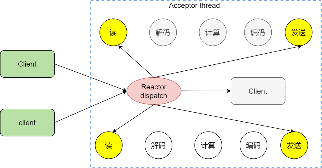 上述几种方案都是在一个线程分发,显然没有利用当今的多核技术,我们完全可以让每个核作为一个IO分发器进行事件的分发,这其实就是reactor模式,也是后续将谈到的事件驱动。
