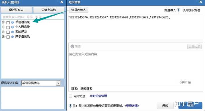 提名一下单位用了好几年的短信群发软件——协同通信ECP,有手机和PC端APP,电信运营商线路稳定、下发及时。PC端使用更频繁些,支持群发器、定时发送。收件人支持选择通讯录、txt导入、直接批量粘贴更快捷。