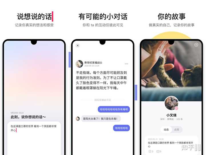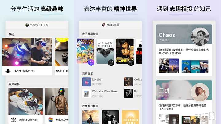界面配色很舒服,兴趣设置非常全面,如果想聊天点进主页看看有共同爱好就可以开始唠,不太会尴尬,有个人帖和问答(类似知乎)面板,可以吐槽碎碎念。
