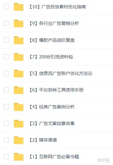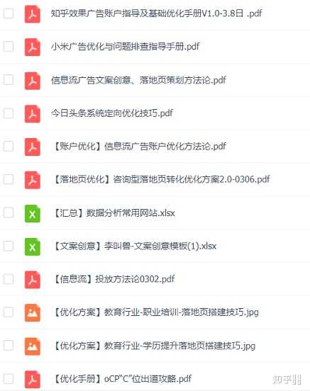 PS:有些知友们总会私信过来问我们一些信息流相关问题,我们也专门整理了关于信息流广告账户优化方法,以及素材优化,文案创意等3.3G广告投放方面相关的内容,有需要的朋友们可以点击下方链接获取!