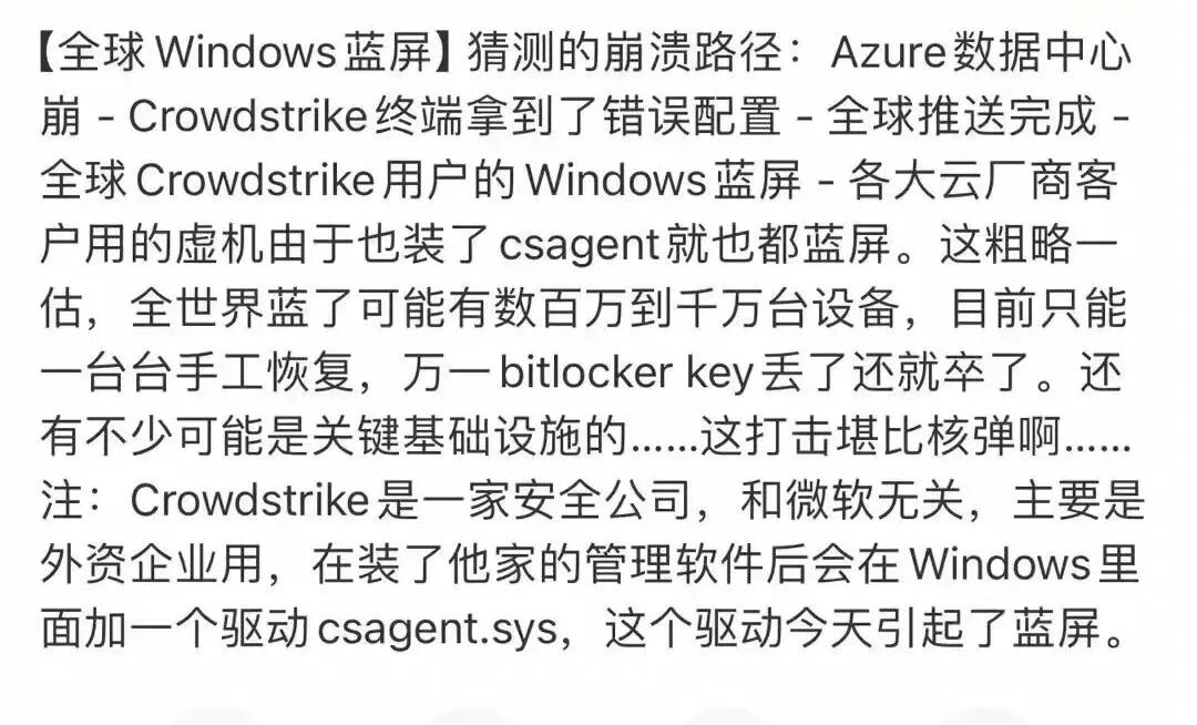 追溯源头,众人也将目光聚焦于微软身上。不过有网友推测出原因,问题可能不是在微软身上,而是因为一个名为 CrowdStrike 驱动产品更新导致了全球大范围的 Windows 蓝屏死机事件。