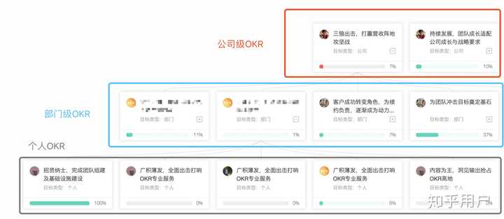 我们可以通过设立公司级OKR(包括全年OKR和季度OKR)来自作为全员指导性目标,进而下设部门级OKR与个人OKR,所有子目标都100%与父目标对齐,都是为了更好地实现公司级的O(目标)而设定。这样一来,全员都可见管理层的OKR,清晰了解我们的企业在每个阶段最终要达到的目标是什么,这对于部门项目和个人任务的设定和决策都起到很好的指导作用。达成一致目标,团队才能朝着同一个方向前进。