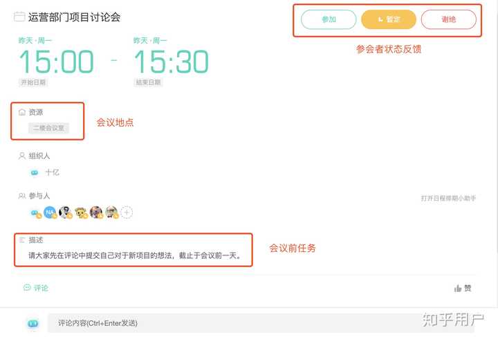 确定会议日程在公司内部应用极广,我们会提前设定好会议时间,告知所有参与者会议地点、议程和参会要求。成员们不仅能够及时反馈参会情况,也能够提前做好准备,并且在评论中公开提交会议想法。这样便于大家及时讨论沟通,负责人也能够进行有效把控。