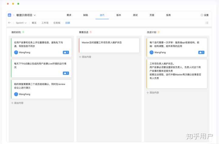 在迭代完成后,通过PingCode,团队成员能够对当前迭代所完成的工作成果进行演示,其他成员可以提出反馈建议,评审完成后进入到迭代回顾会议,在回顾会议上成员一起讨论当前迭代做的好的、做的不好的以及改进计划,同时记录在迭代回顾板上。