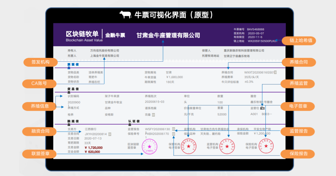 图2展示的是万向区块链创新提出的“牛票”。我们把它做成了大家比较熟悉的票据格式,看起来很像发票的界面。这个牛票反映了现时现刻牛只的票面信息、货品信息、融通信息、认证信息,包含了签发机构、养殖信息、合同、监管报告等各种信息,以及保险机构、银行、资产方等参与方的电子签章。每张牛票与线下真实存在的肉牛唯一对应,这个票据的流转也与线下牛只所属权的流转相对应,从而引入更多资金方来盘活农业金融。