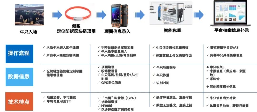 万向区块链生物资产可信监管及金融服务平台使用的项圈、耳标、脚环等传感器,以及一些注射式的芯片设备,通过NB-IoT、LoRa、蓝牙等传输方式,将采集到的数据上传至区块链平台。万向区块链的生物资产融资管理平台从上链存证,到数据验证;以及从早期手持机的录入,中间的养殖管理、称重,到后期的出栏,都实现了全过程的闭环与标准化SOP。