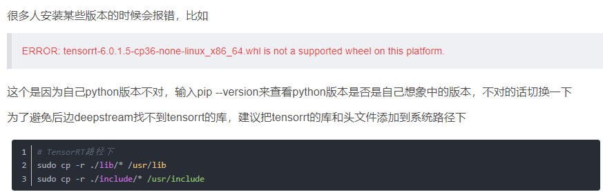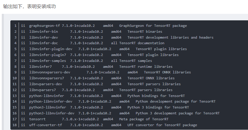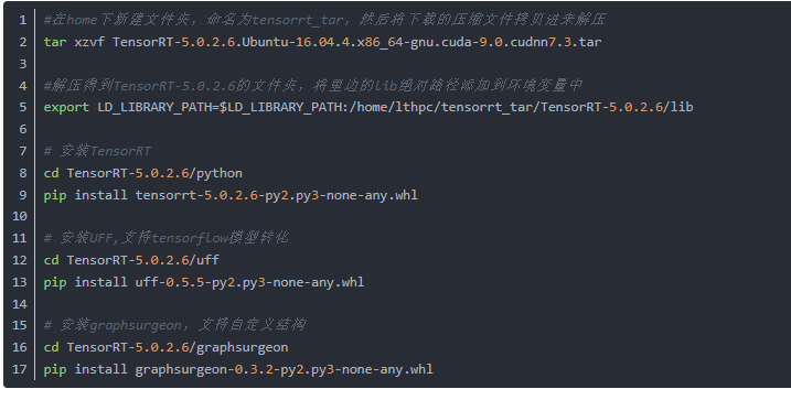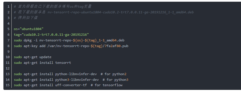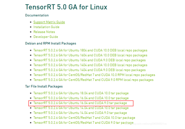 tensorrt的安装方式很简单,只需要注意一些环境的依赖关系就可以,我们以tensorrt5.0.4版本为例,参考官网安装教程https://docs.nvidia.com/deeplearning/sdk/tensorrt-install-guide/index.html,这里简单总结一下步骤