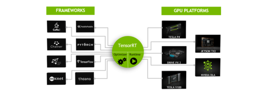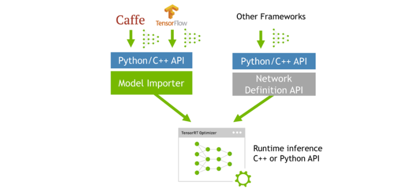 而tensorRT 则是对训练好的模型进行优化。tensorRT就只是推理优化器。当你的网络训练完之后,可以将训练模型文件直接丢进tensorRT中,而不再需要依赖深度学习框架(Caffe,TensorFlow等),如下: