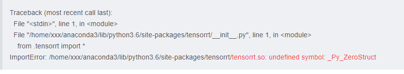 如果导入tensorrt报错如下,则是因为python版本不对,应根据2.1节上边的那个表调整自己的python版本
