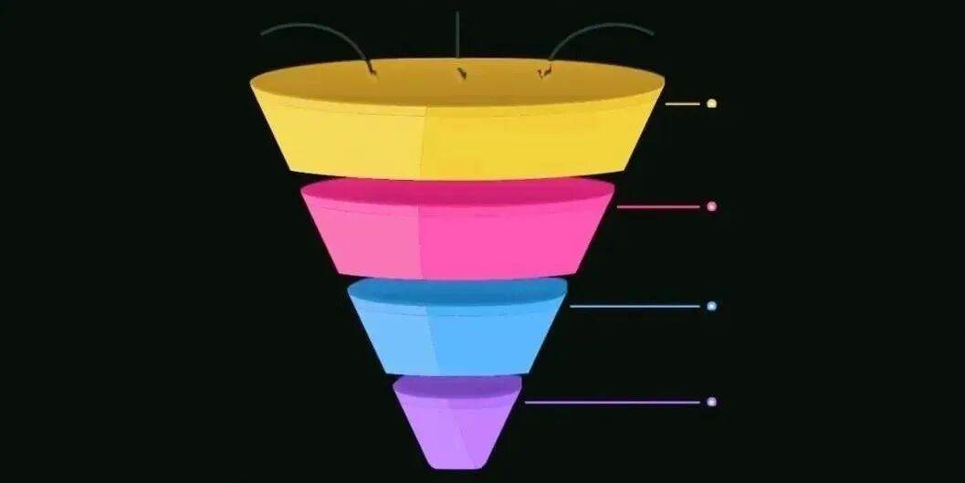 漏斗图(funnel chart)类似于漏斗的形状,其中每个部分逐渐变窄。分段垂直排列,以显示层次结构。在漏斗图中,每个分段对应于顺序过程中的一个步骤或阶段。它们说明了数据点在各个阶段中的进展。