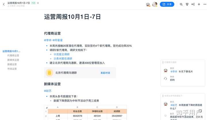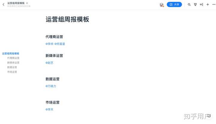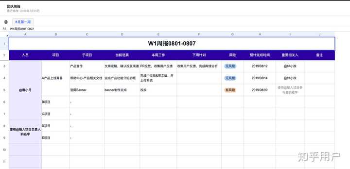 例如,运营团队的周报文档/表格,把部门的业务列为不同模块, @ 相关负责人进行补充填写。