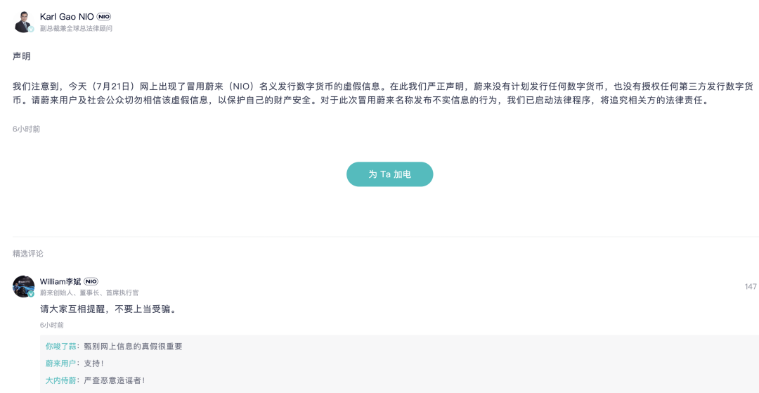 蔚来副总裁兼全球总法律顾问高岗在蔚来App内发布声明称,7月21日网上出现了冒用蔚来名义发行数字货币的虚假信息。蔚来声明,没有计划发行任何数字货币,也没有授权任何第三方发行数字货币。蔚来方面表示,对于此次冒用蔚来名称发布不实信息的行为,已启动法律程序,将追究相关方的法律责任。