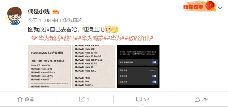 昨日,微博花粉超话主持人@偶是小贱 曝光了HarmonyOS 3首批升级机型和升级时间。首批升级机型会在7月27日当天开启推送,机型包括华为Mate X2/Xs、华为Mate 40/Pro/Pro+/RS、华为P50/Pro、华为P50 Pocket、华为MatePad Pro 12.6英寸2021款。第二批机型会在8月上旬推送,涵盖华为Mate 40E/Pro、Mate 30系列、P40系列等多款机型。值得一提的是,HarmonyOS 3将会直接推送,不再内测。