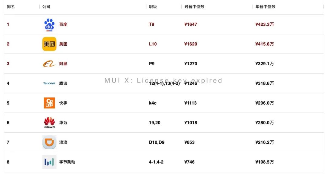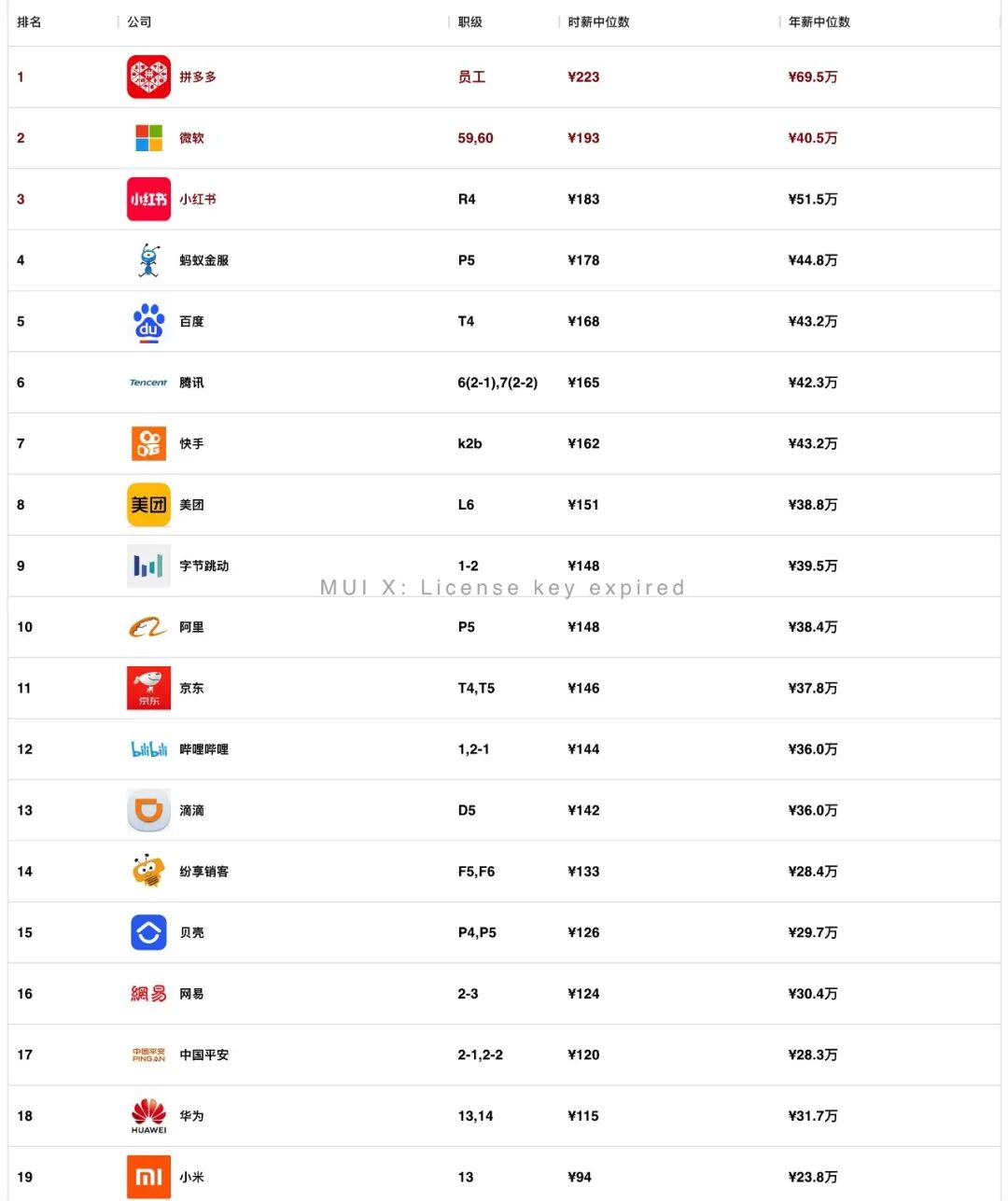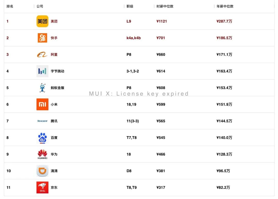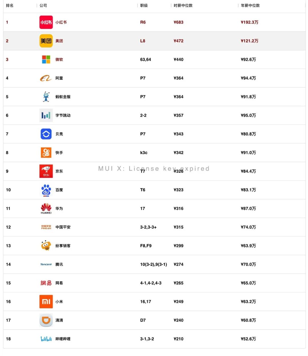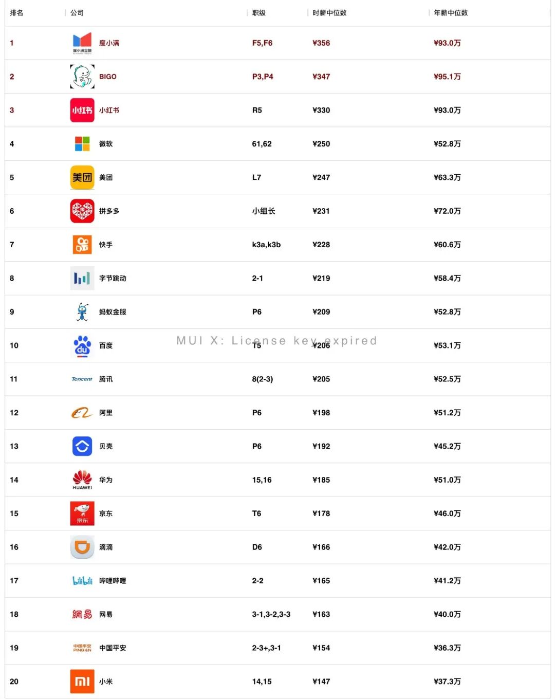最近在职级对标网站上看到了一个排行榜,是针对国内的一线互联网企业做的调研,汇总了他们的平均时薪水平。